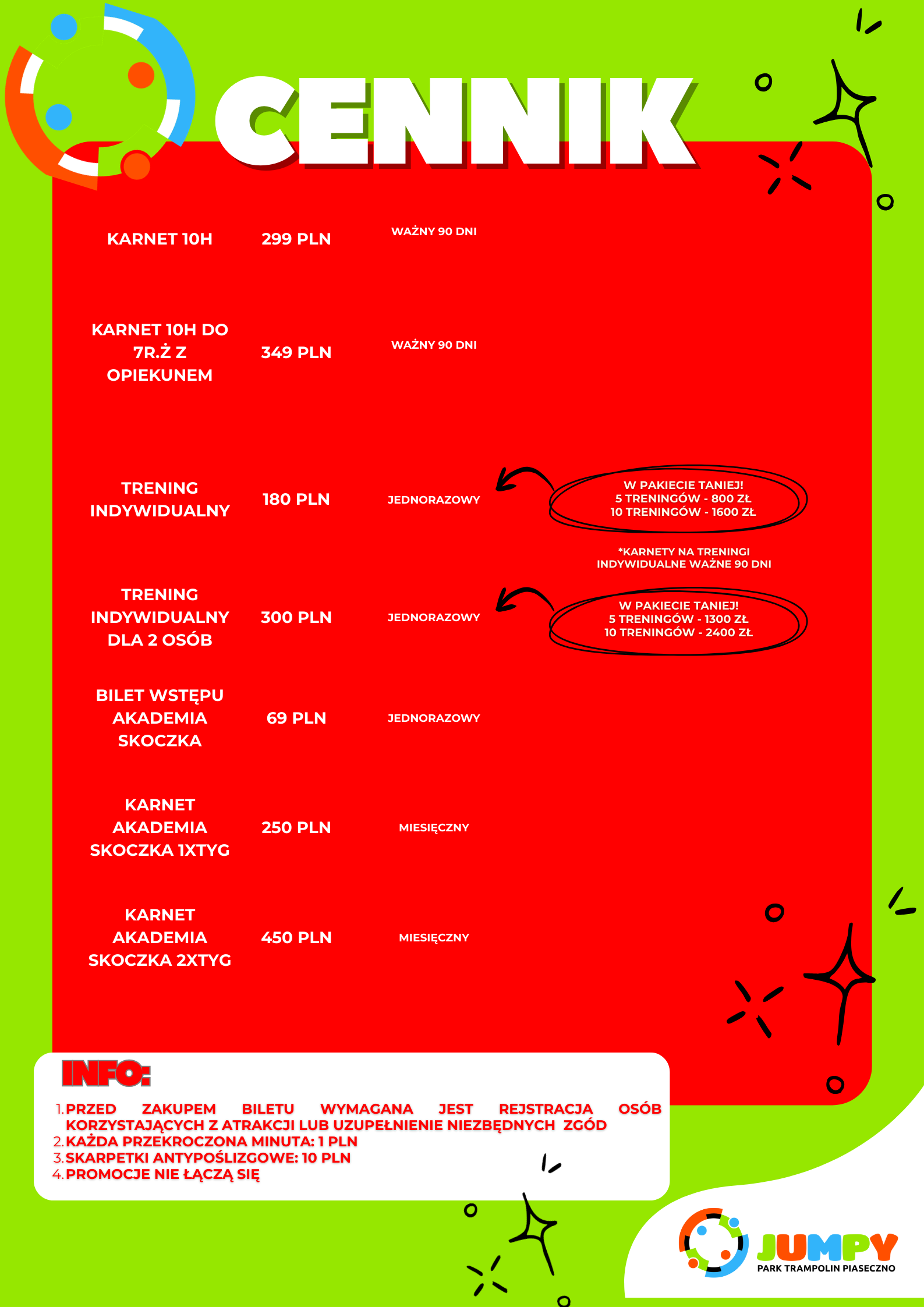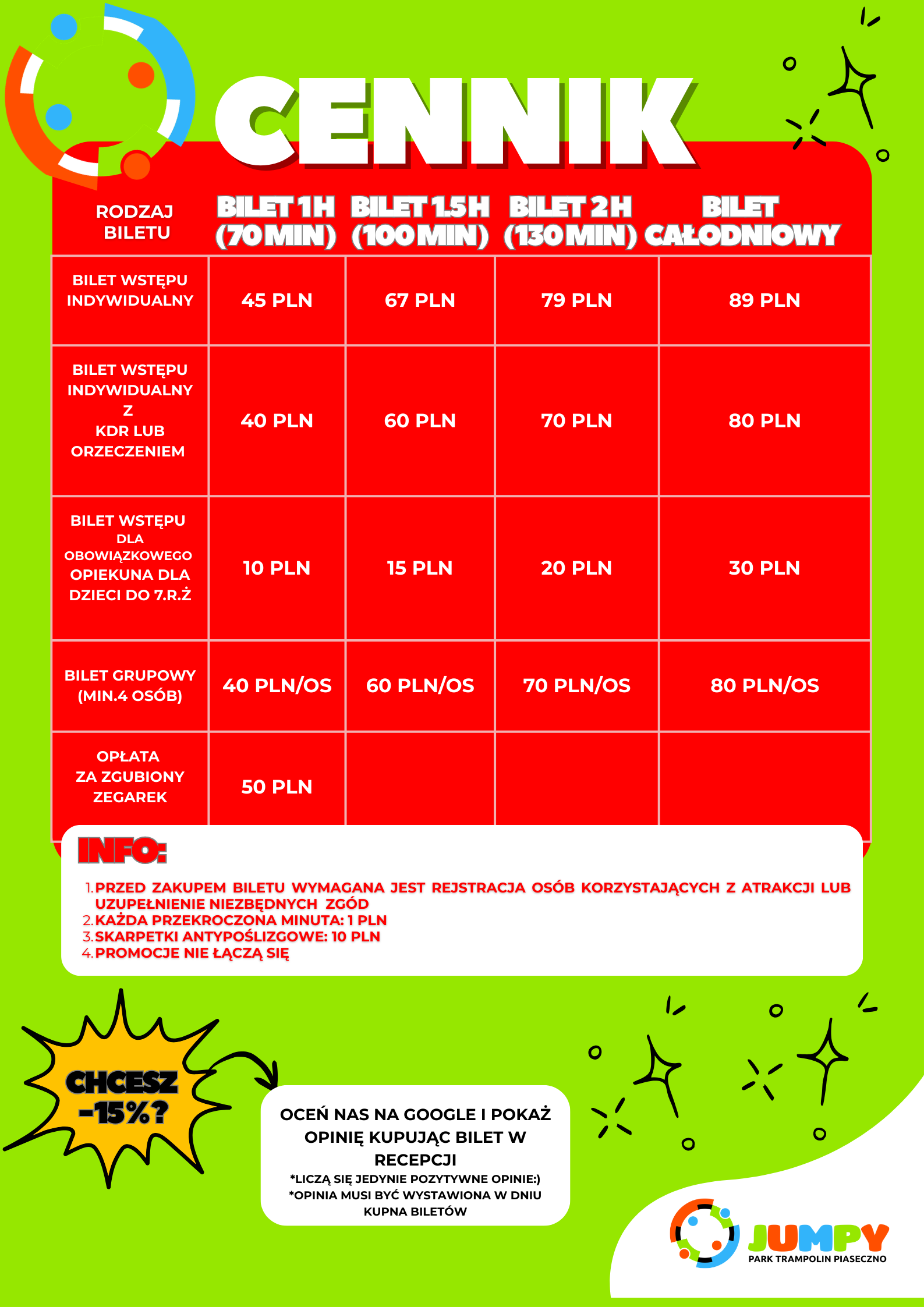 Specjalnie dla Was wprowadziliśmy innowacyjne rozwiązanie! Nie czekaj w kolejkach! Wystarczy, że zarejestrujesz swoje konto pod linkiem : https://jumpy.oos.pl/customer/chooseRegistration aby zaakceptować wszelkie potrzebne zgody na korzystanie z usług naszego Parku. Jeżeli przychodzisz do nas z dziećmi je również dodaj do swojego konta. Po podejściu do kasy wystarczy nam Twoje imię i nazwisko, żebyśmy mogli do Twojego konta podpiąć Wasze bilety. Nie trać czasu, skocz do JUMPY!